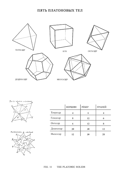 На рис. 11 показано пять Платонических тел. В результате исследований в Weisser-Hirsch было установлено, что все химические элементы, за исключением водорода, кислорода и азота, построены на основе известных платонический тел: тетраэдров, кубов, октаэдров, додекаэдров и икосаэдров. Ни один элемент, построенный на основе додекаэдра, не был найден, но частицы, которые сформировали центральное ядро в нескольких элементах, имели группы по шесть Ану в двадцати углах додекаэдра.