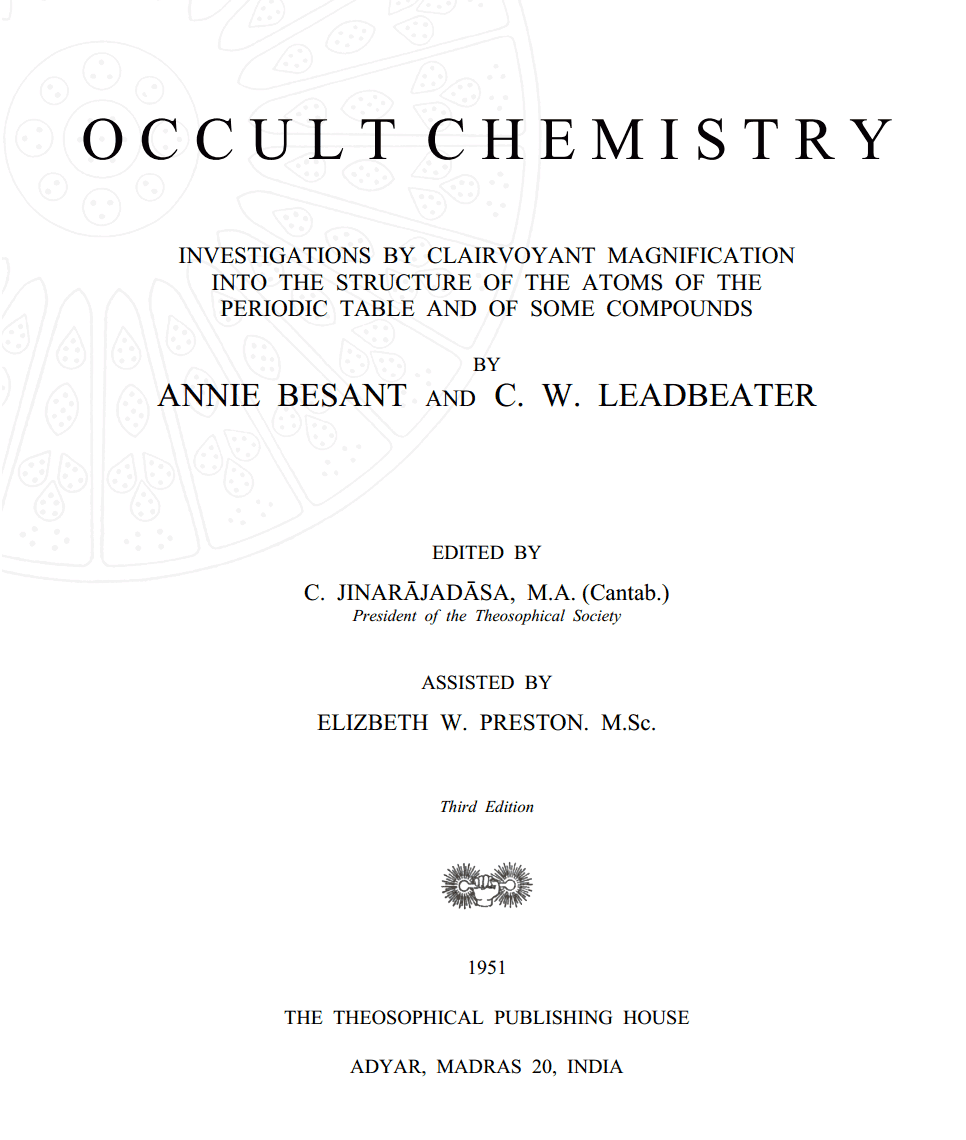 Почти все диаграммы были повторно отображены в течение последних трех лет, при наблюдении Мисс Элизабет Престон, которая была ознакомлена с работой оккультной химии в течение последних двадцати лет. Я дал ей полное право на формирование третьего издания и желаю выразить свои глубокие обязательства, так как я не способен одновременно справляться со своими обязанностями как президента Теософского Общества и в тоже время уделять адекватное внимание наблюдению за работой.